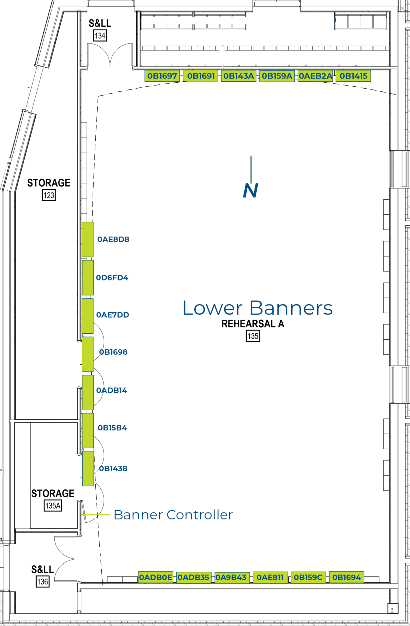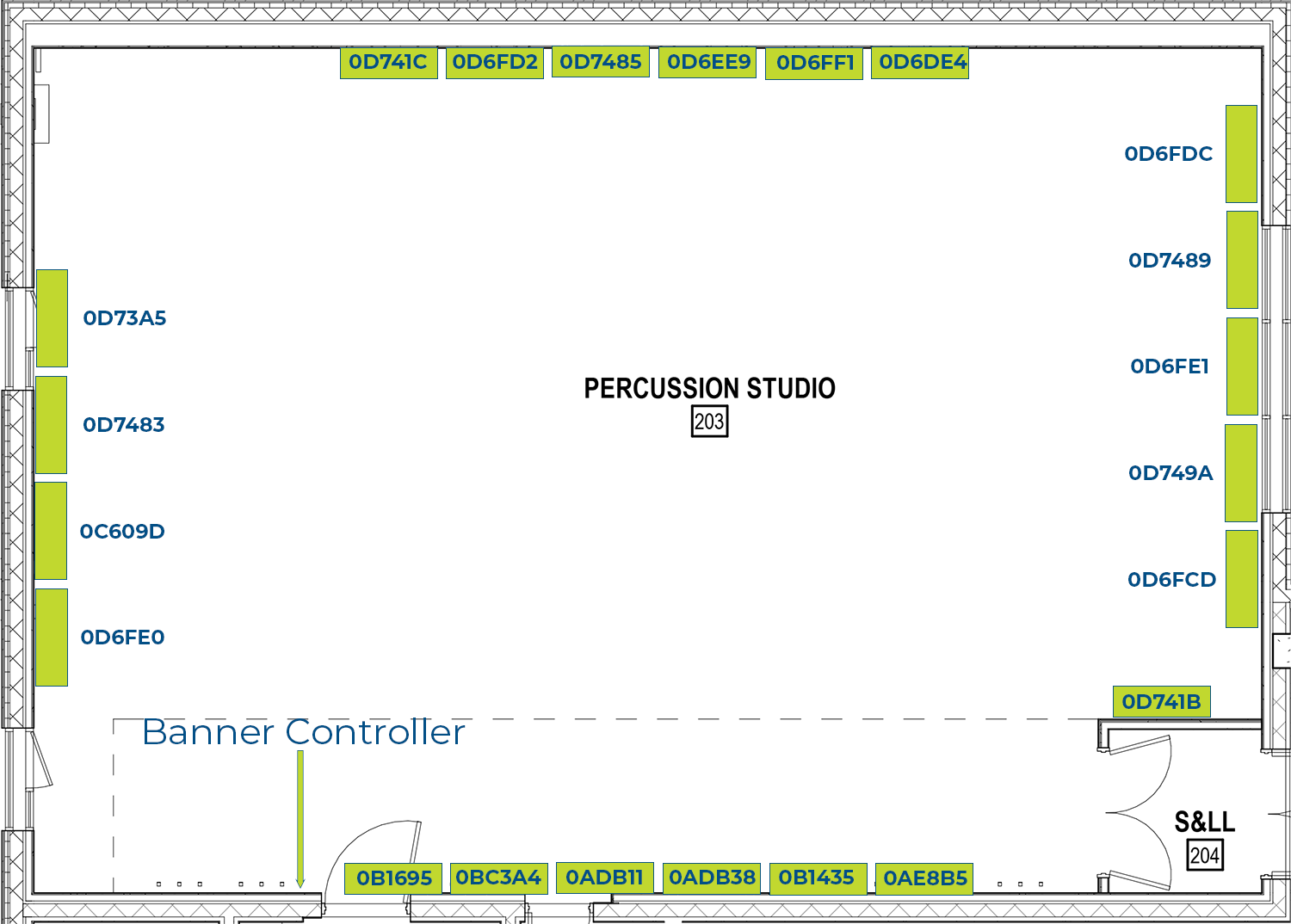 The below image is the layout of addressable retractable banners in Rehearsal C (Percussion Studio). These banners are controlled via a wall panel located on the wall between the south exit door and the storage room. This panel is behind a lockable cover and the banners should only be deployed by WYSO staff members. The key for the lockable cover is marked “Tongda Master” and is on a lanyard that is on the back of the Facilities office door (Room #104).