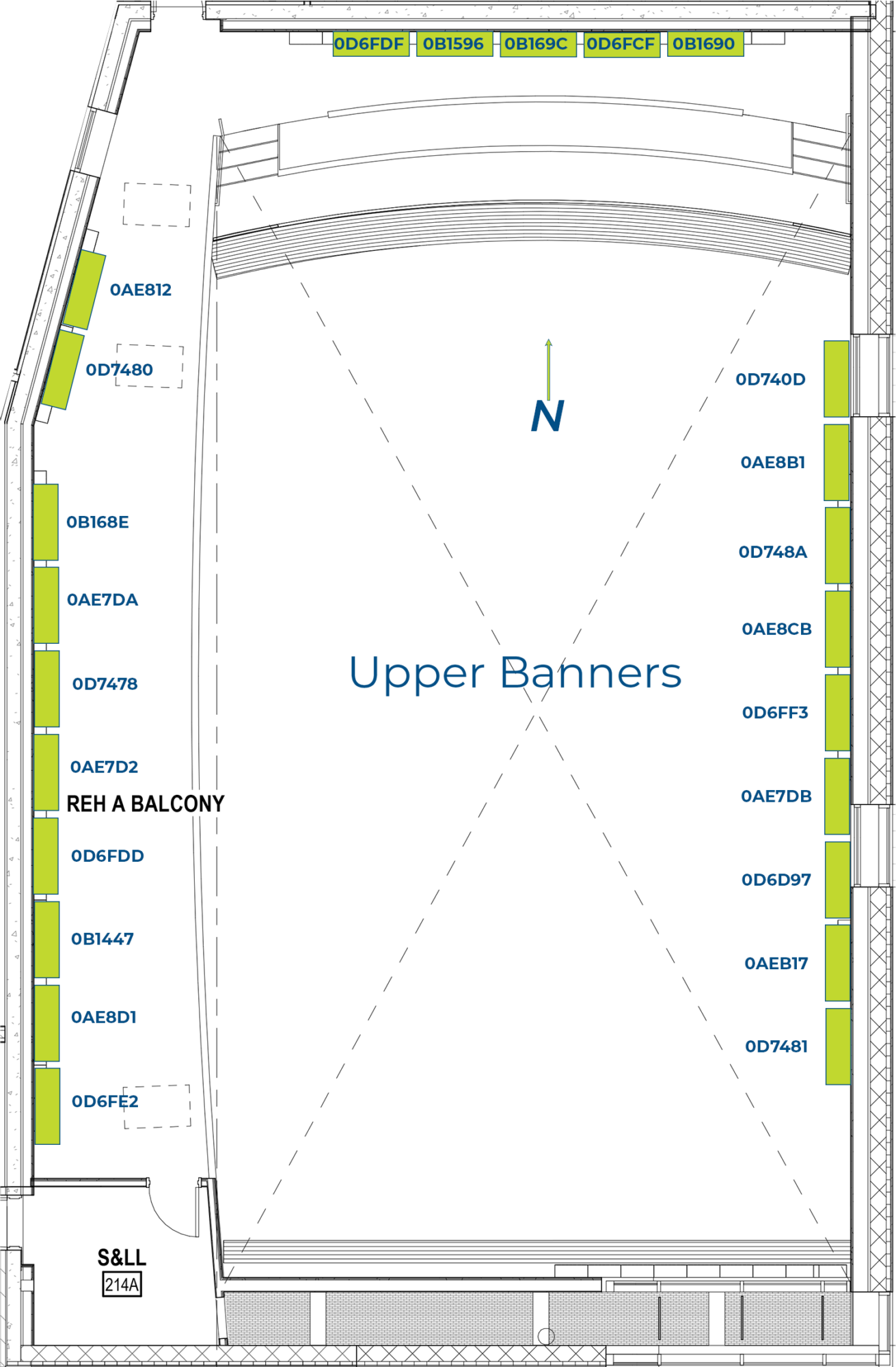 The below images are the layout of addressable retractable banners in Rehearsal A. These banners are controlled via a wall panel located on the wall between the south entrance door and the storage room. This panel is behind a lockable cover and the banners should only be deployed by WYSO staff members. The key for the lockable cover is marked “Tongda Master” and is on a lanyard that is on the back of the Facilities office door (Room #104). Following the images of the banner layouts, there is a table with the five preset configurations of banner deployment.