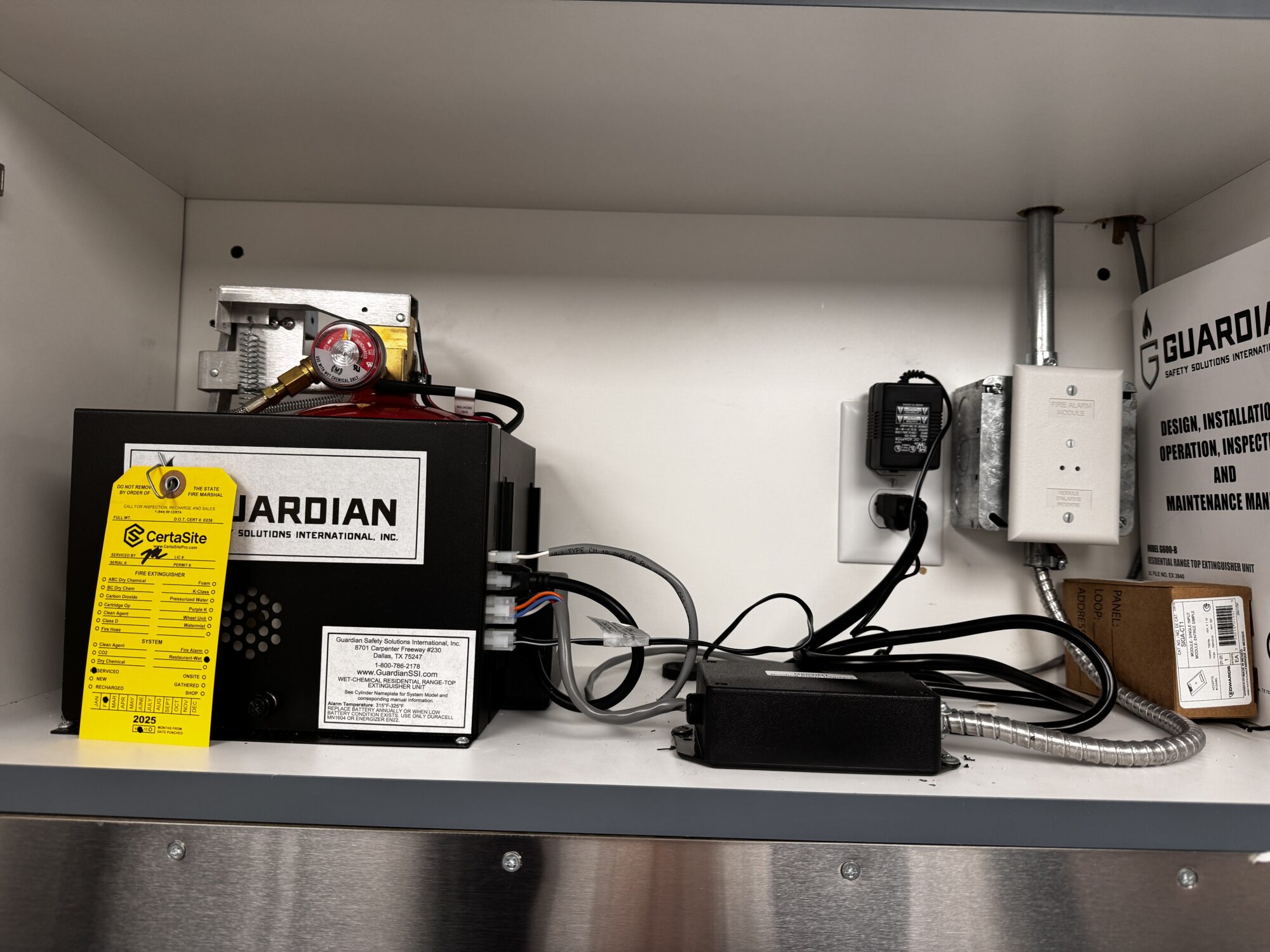 A second fire suppression system is in place for the range hood in the Break Support room. The range hood system was installed by CertaSite. The system is also inspected and serviced by CertaSite. Inspections are required semi-annually and are scheduled by the CertaSite tech.