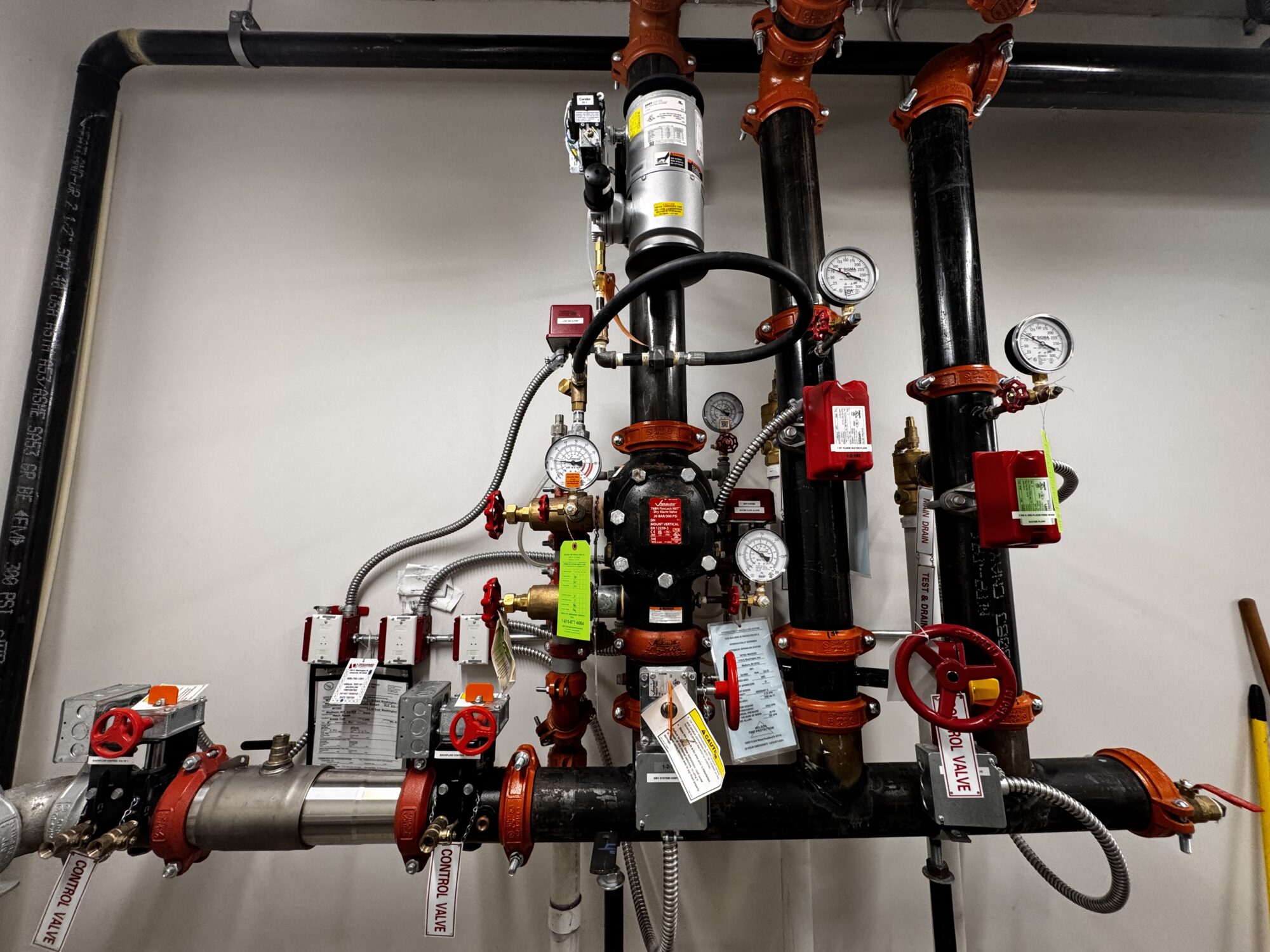 There are risers in Stairwell B that can isolate and drain the sprinkler system for each floor. Annual inspections should be scheduled before December.